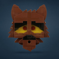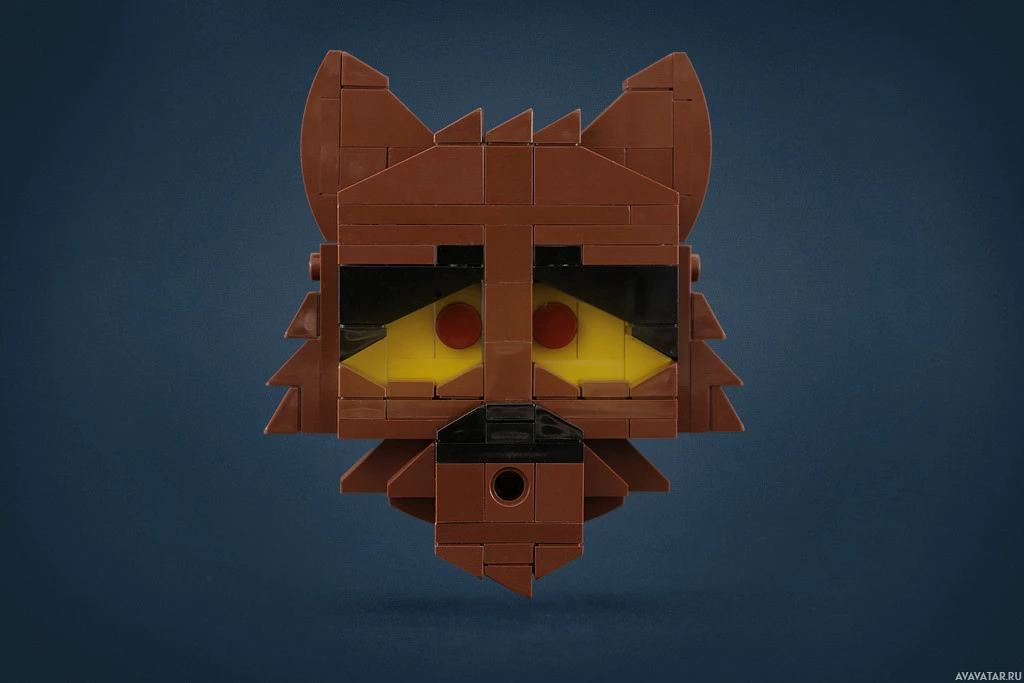 an open mouth revealing sharp teeth, all rendered in brown bricks. The background is dark blue, providing a strong contrast that highlights