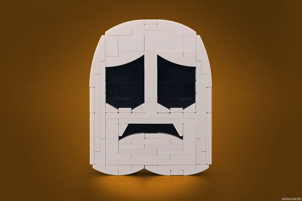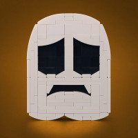 a Lego figure constructed in the shape of a ghost. The head is transparent with the face made from black