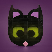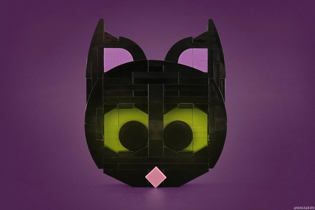 На фото изображена кошка Lego. Он состоит из различных частей, вероятно, из разных наборов Lego, чтобы создать форму и внешний вид лица кошки. Глаза светятся, что придает ему жуткий или жуткий вид.