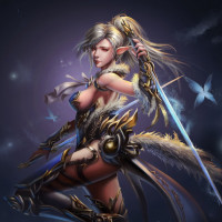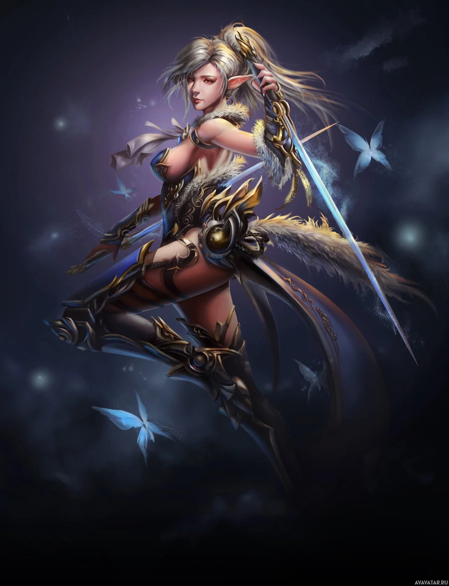 fantasy character who appears to be an elf. She is holding a sword and has a bow as part of her attire, suggesting that she may have skills in both weaponry types. She's wearing armor with a fantastical design and has wings on her back, which are commonly associated with elves in