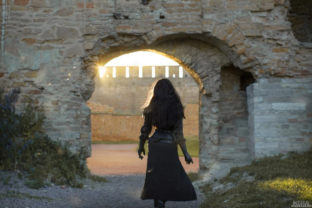 The image depicts a person wearing a costume that resembles the character Yennefer from "The Witcher"