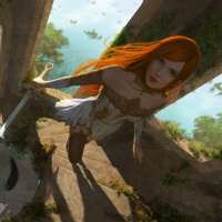 red hair holding a sword. She appears to be standing in front of an ancient, crumbling structure that could be a ruin or part of
