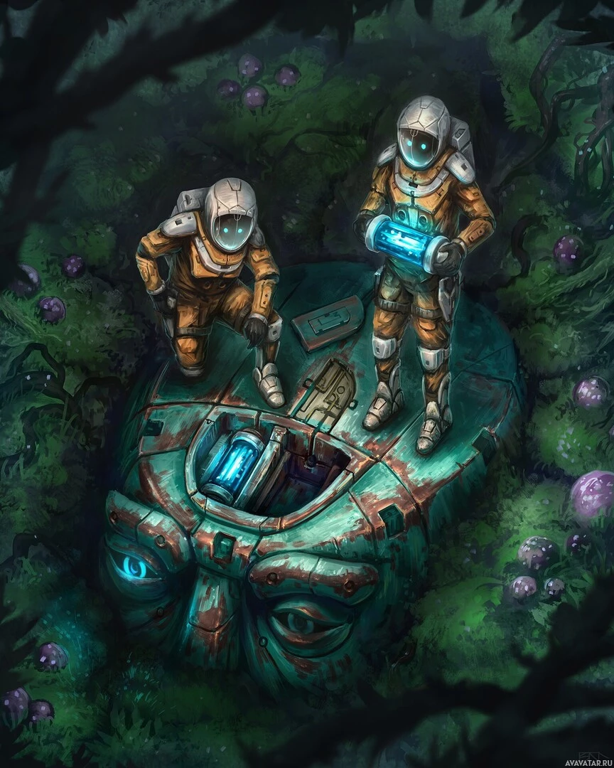 an alien environment. Between them is a strange structure that resembles an ancient artifact or some sort of