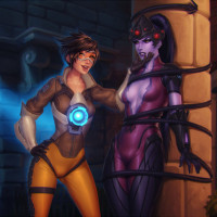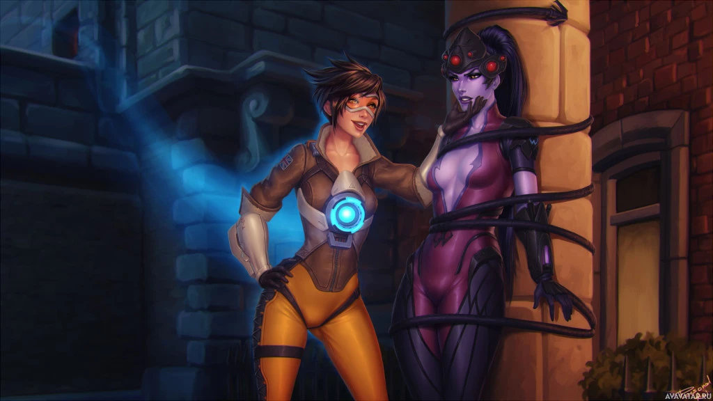 video game "Overwatch." On the left, there is Tracer, a character known for her ability to manipulate time and her orange and