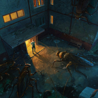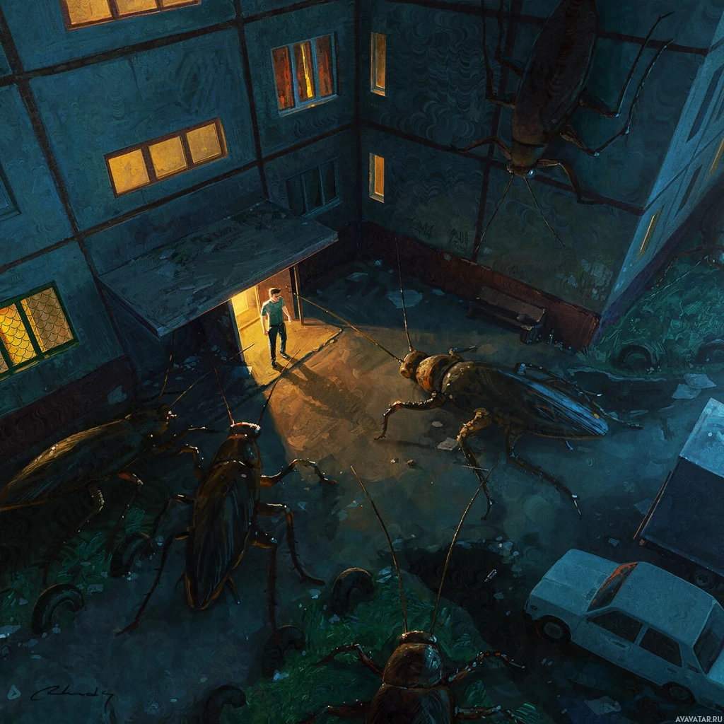 a nighttime scene where several large insects are converging on a man who is standing in the middle of an alley. He appears to be looking at the insects with concern, as they seem to be drawn towards him. Behind the man is an open doorway leading into a building, which contributes to