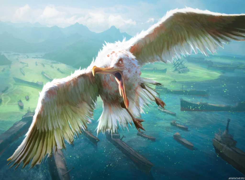 The image shows a bird, likely a seagull, flying in the air with its wings spread wide. It appears to be screeching or calling out loudly. Below the bird is an expansive