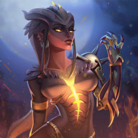 a muscular build, is wearing armor with a prominent chest piece that seems to have some kind of emblem or symbol on it. Her skin tone is dark, and she has a serious