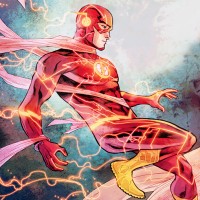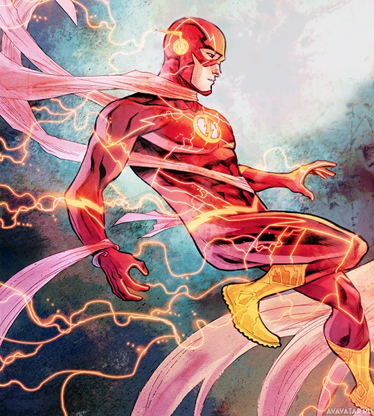 the iconic superhero known as the Flash, who is depicted with his signature red and gold suit. The character is in mid-action, running at