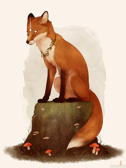 The image depicts a fox sitting on a rock or stump in what appears to be