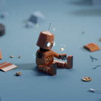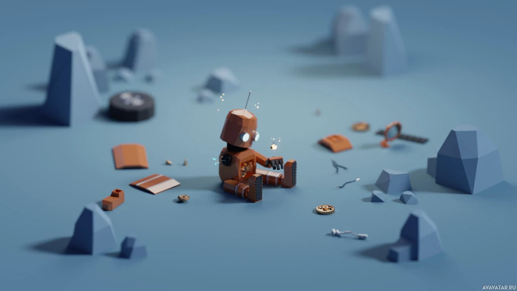 The image depicts a 3D animated robot in an environment that resembles