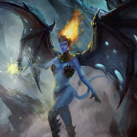 The image depicts a fantasy-themed scene featuring a creature that is often referred to as a succubus. This creature has the upper body and wings of a dragon, with