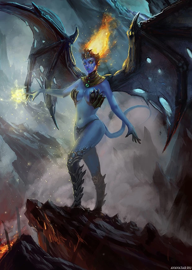 blue skin and horns, and the lower body of a human female. She is adorned with