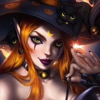 a female character with vibrant red hair, wearing a witch hat. She has striking