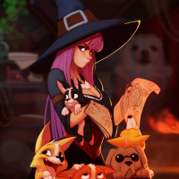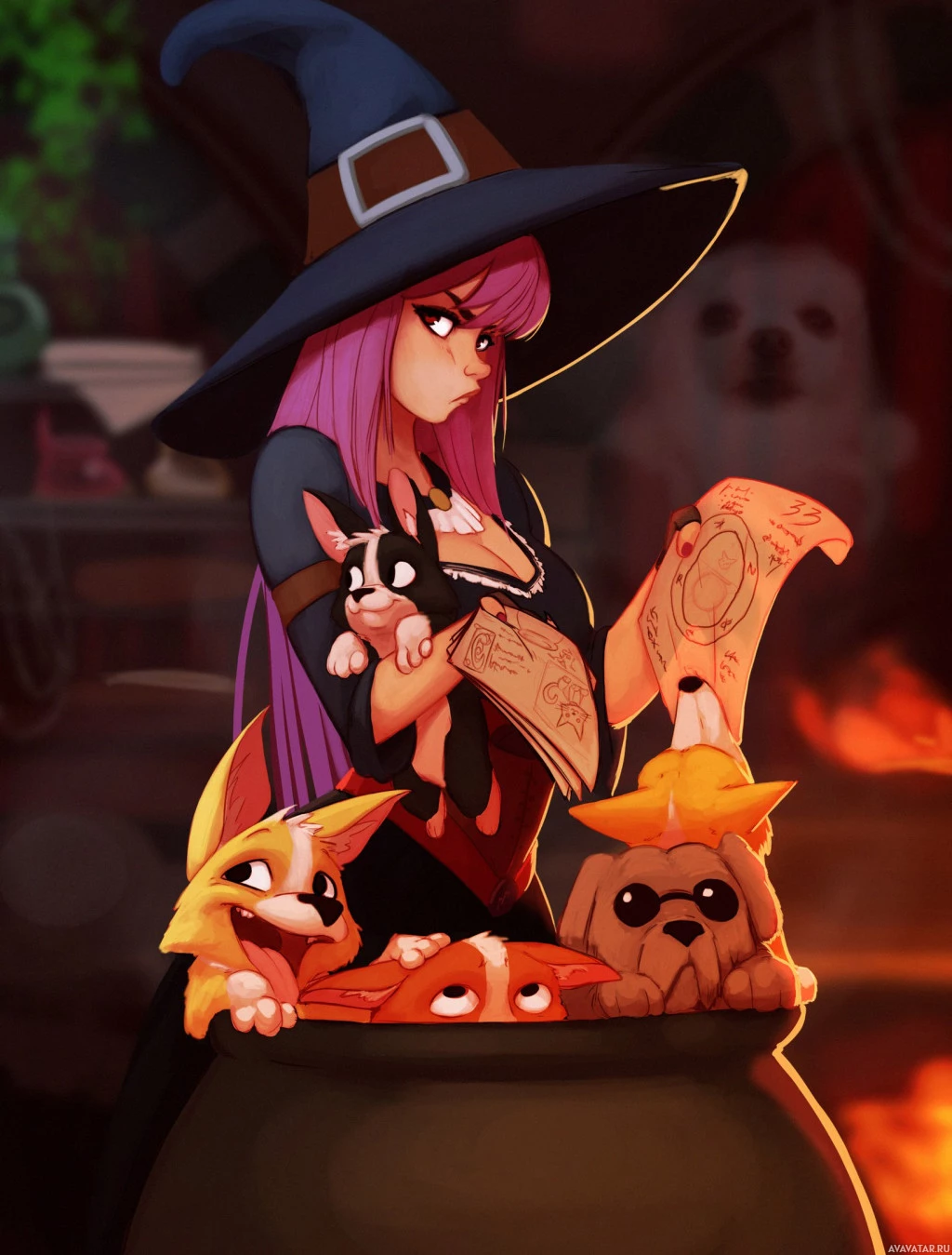 an animated character who appears to be a witch with pink hair, wearing a witch hat. She is surrounded by three different breeds of dogs: