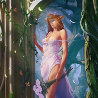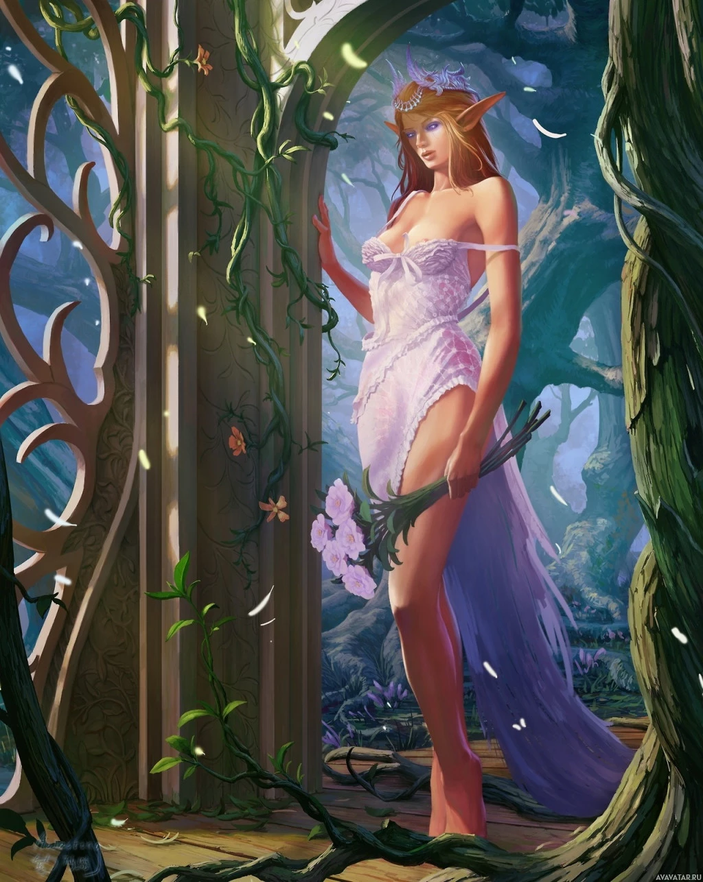 a fantasy scene with an elf. The elf is standing in what appears to be a fairy-tale