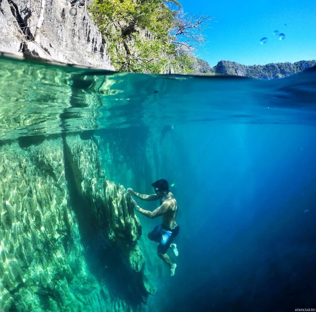 an underwater view of a person submerged in water. Above the diver, there's a clear