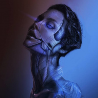 The image shows a figure that appears to be a blend of human and robotic elements. The face is human but has mechanical components such as gears or metal parts integrated into the structure, suggesting a theme related to