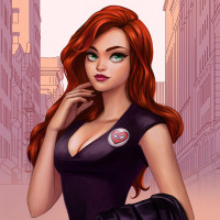 a confident pose with her hand on her chin, which suggests a thoughtful or assertive demeanor. The character is drawn in a stylized manner, common for