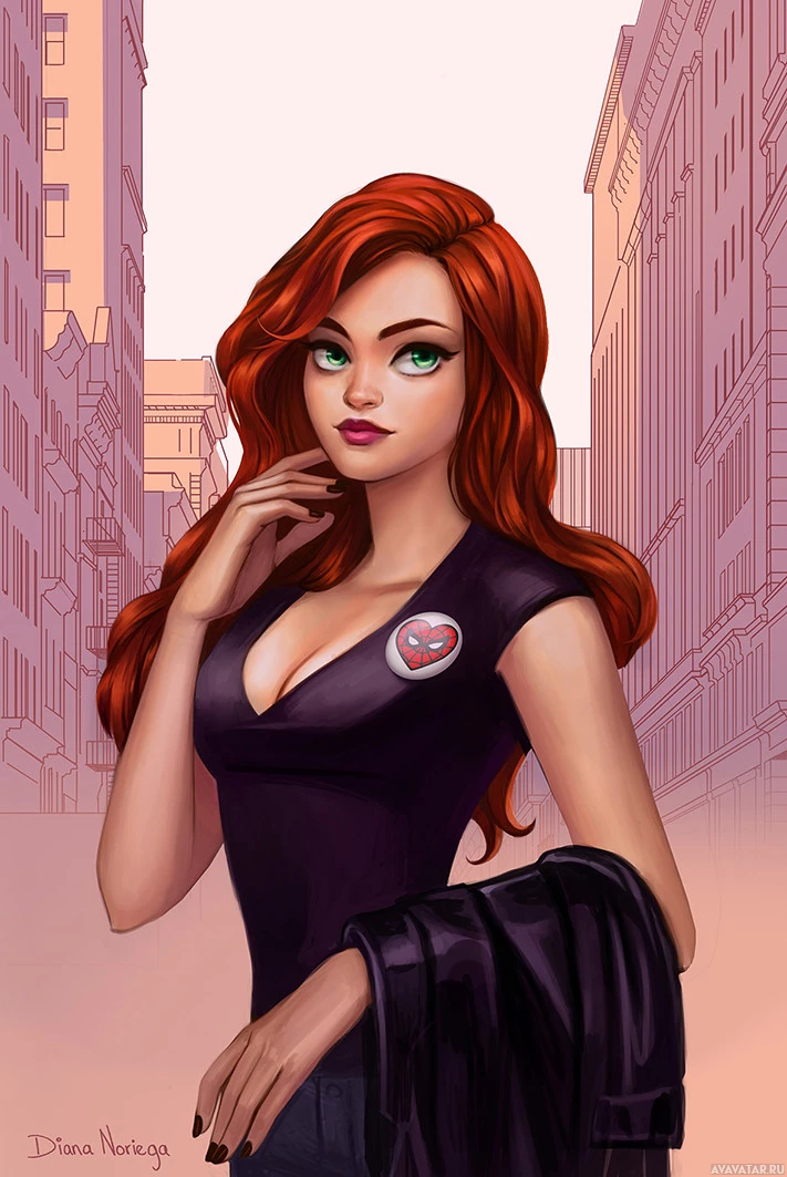 a female character with red hair, wearing a black top and standing in what appears to be an urban environment. She has
