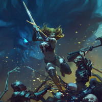 a female character in the midst of battle. She is holding a sword and appears to be fighting against an enemy that resembles a large, menacing creature, possibly a fantasy or