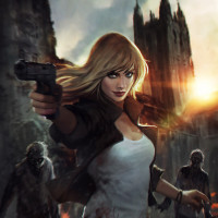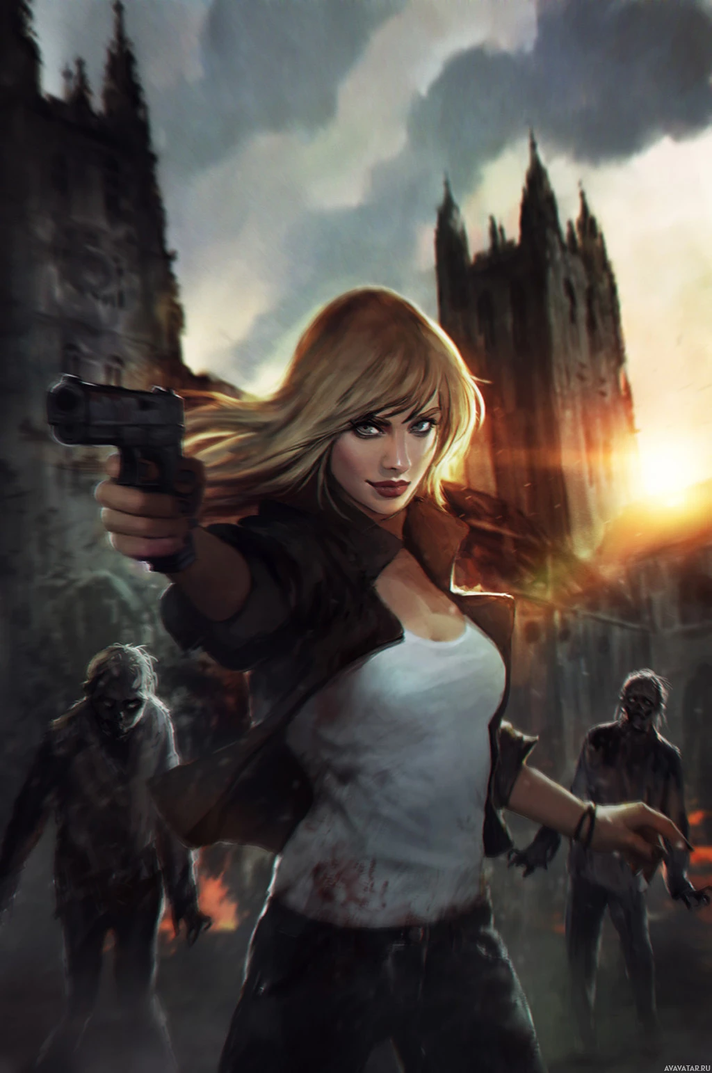 blonde hair and is dressed in what appears to be tactical or combat gear, suggesting she may be involved in some form of action or conflict situation. In the background, there are figures that resemble zombies, which adds to the theme of danger or survival in a horror-themed context. The setting looks like it could be
