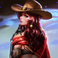 character design and style are reminiscent of characters found in video games, particularly those set in a Western theme, possibly referencing a character like Mercy from "Overwatch."