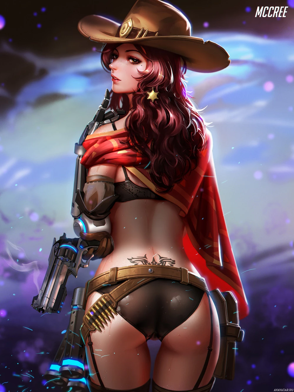 red hair, wearing a cowboy hat and holding a gun. She is dressed in attire that resembles traditional