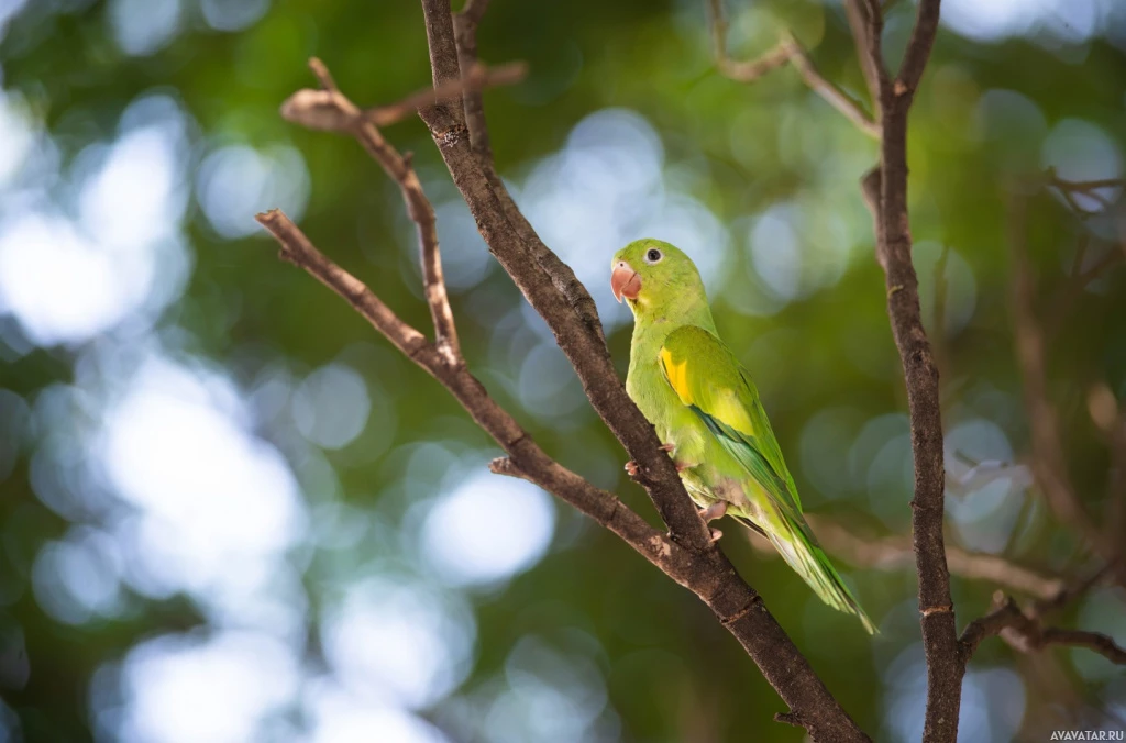 vibrant colors and alert posture, looking out towards the viewer.