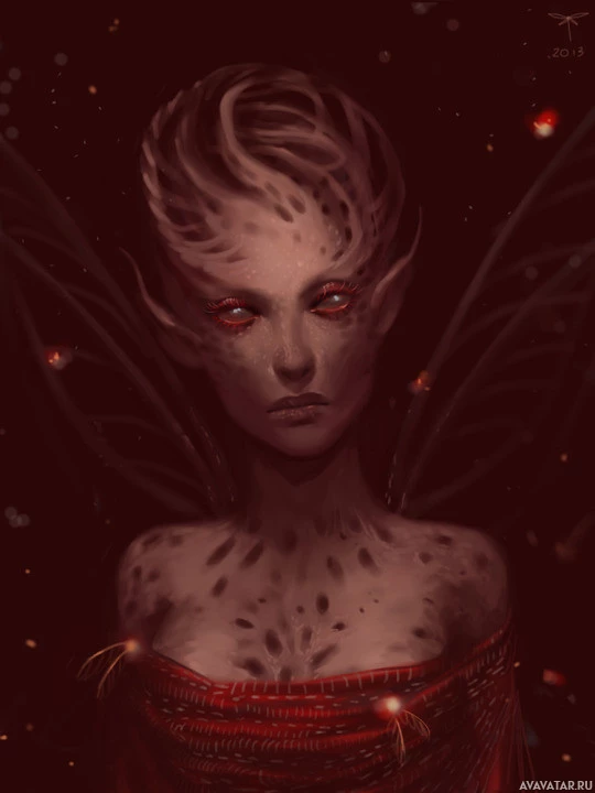 pointed ears resembling those of an elf or faerie; her eyes are red and glowing, giving her a menacing or otherworldly appearance; and she has prominent horns that suggest a demonic or monstrous nature. Her expression is serious, and she has