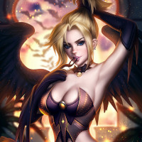 lit sky with some clouds, along with silhouettes of what might be trees, creating a serene and mystical atmosphere. There are also small hints of pumpkins in the lower part of the image, which might suggest a Halloween or autumnal theme. The artwork is rich in detail and color, giving it a vibrant and dynamic quality.
