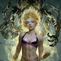 a sleeveless bodysuit and is surrounded by a glowing, energetic environment that seems to emanate from her hands. The setting suggests