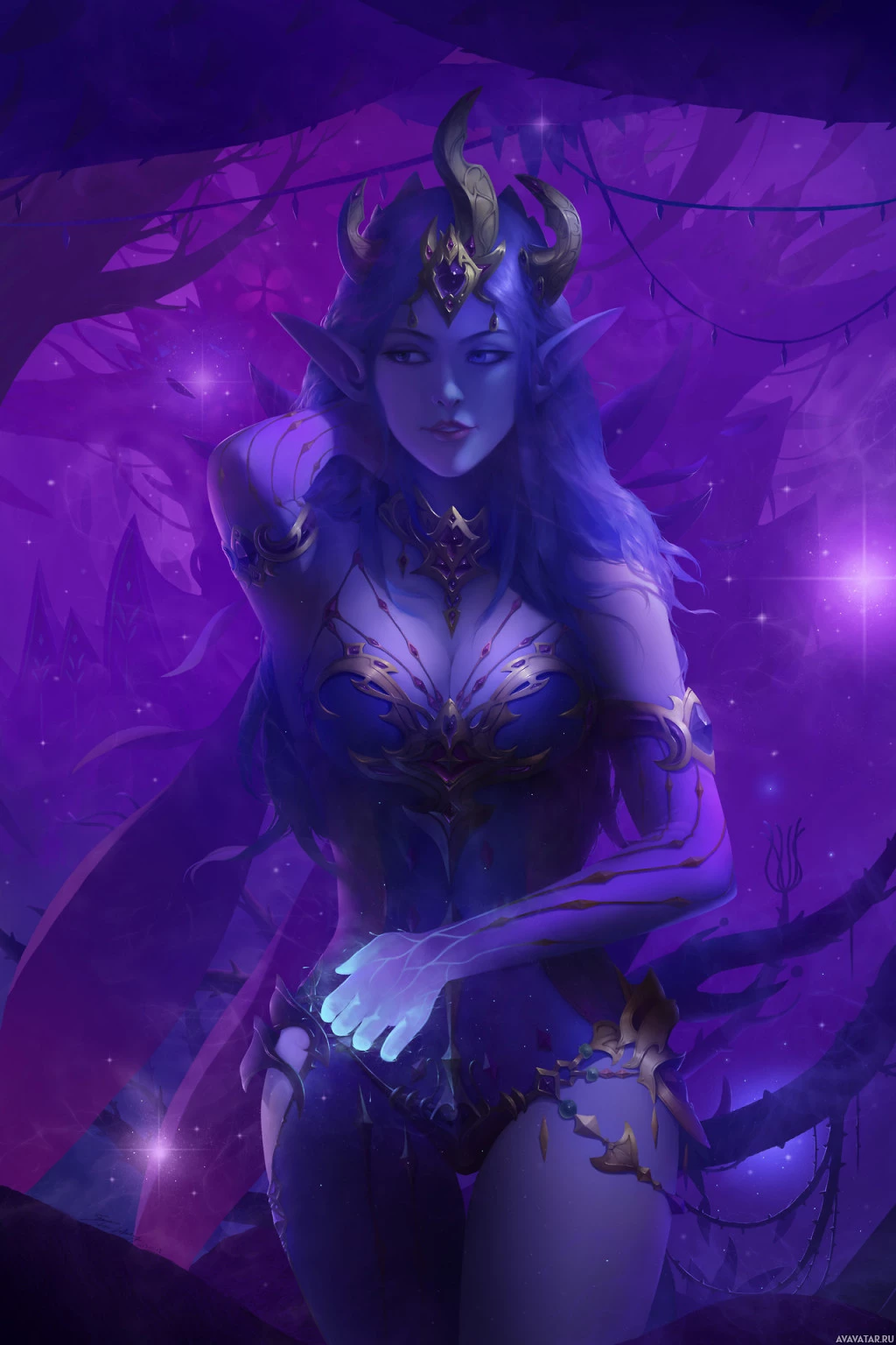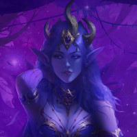 intricate jewelry and has horn-like extensions on her head. She stands amidst a purple, magical forest setting with twisted trees that add to