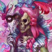 skeletal structure of the skull is visible, with the ribcage and spinal column discernable underneath the costume's layers. In their hand, they hold a fan, which is typically used to cool oneself or to add movement to performance. This adds a dynamic element to the image, suggesting that the character is not just a static figure but one that might be in motion or in the midst of an act. The overall impression is of a fantastical and somewhat eerie entertainment figure, blending elements of a traditional clown with the stark reality of a skeleton.