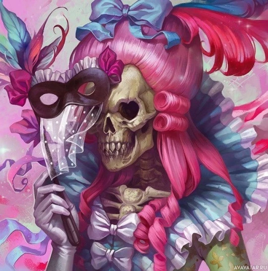 The image depicts a stylized character that appears to be a fusion of a skeleton and a performer. This character has the skull as the head with large, expressive