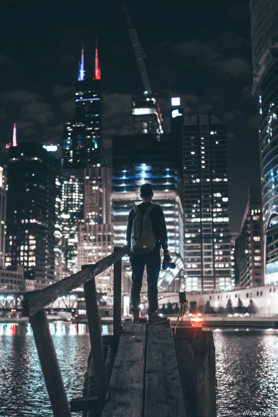 The image features a person standing on a pier or breakwater at night, overlooking