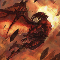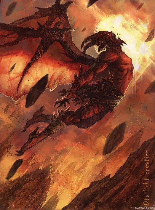 a fantasy scene with a demonic creature. The creature appears to be a dragon or a similar mythical monster, characterized by its large wings and