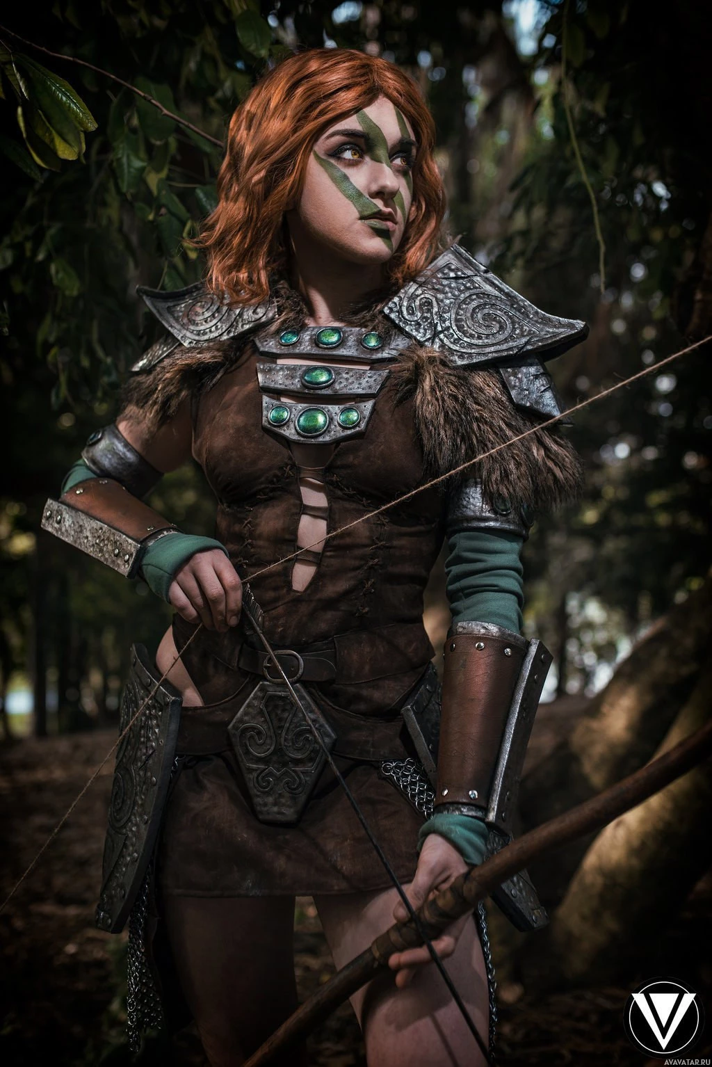 The image depicts a person dressed as Aela the Huntress, a character from "The Elder Scrolls"