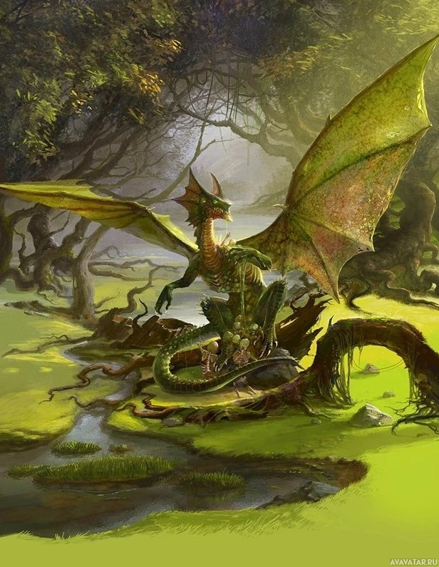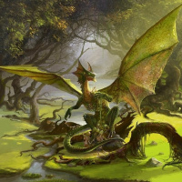 a fantasy scene featuring a dragon. The central figure of the image is a green dragon with