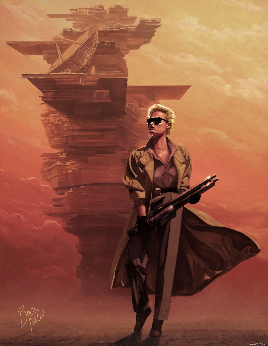 towering figure or wall structure to her left, which contributes to the grandiose and mysterious atmosphere of the image. The color palette consists of
