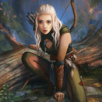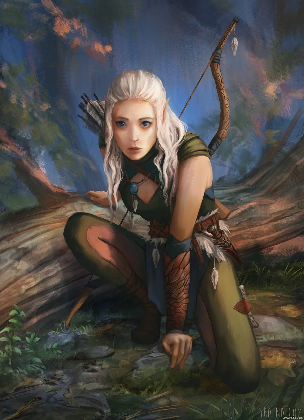 a fantasy character, likely an elf due to the white hair and the context of being in a fantasy setting. The character is portrayed with a bow, suggesting they might be involved in archery or hunting within their narrative. They are wearing armor, which could indicate a role as a warrior or protector. The character has a thoughtful or contemplative expression on their face, and the background suggests a natural, possibly woodland environment, which is common for