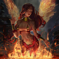red hair, dressed in what appears to be fiery attire. She is surrounded by flames, and there's