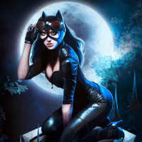 a crescent moon above and silhouettes of trees around her. The overall ambiance suggests it could be nighttime or set in a noir-style scene.