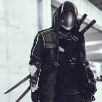 large swords crossed in front of their body, one in each hand. The armor has a sleek and modern design, suggesting a setting that could be from
