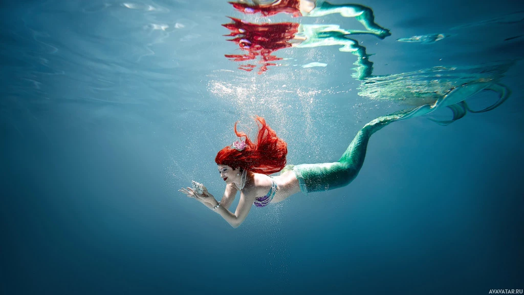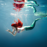 animated film "The Little Mermaid." They are underwater with their arms spread out to either side. The lighting creates