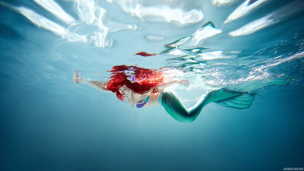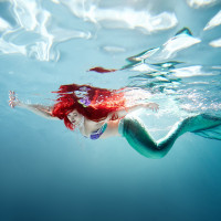 The image shows a person submerged in water, appearing to be swimming underwater. They are wearing a costume that resembles Ariel from the Disney movie "The