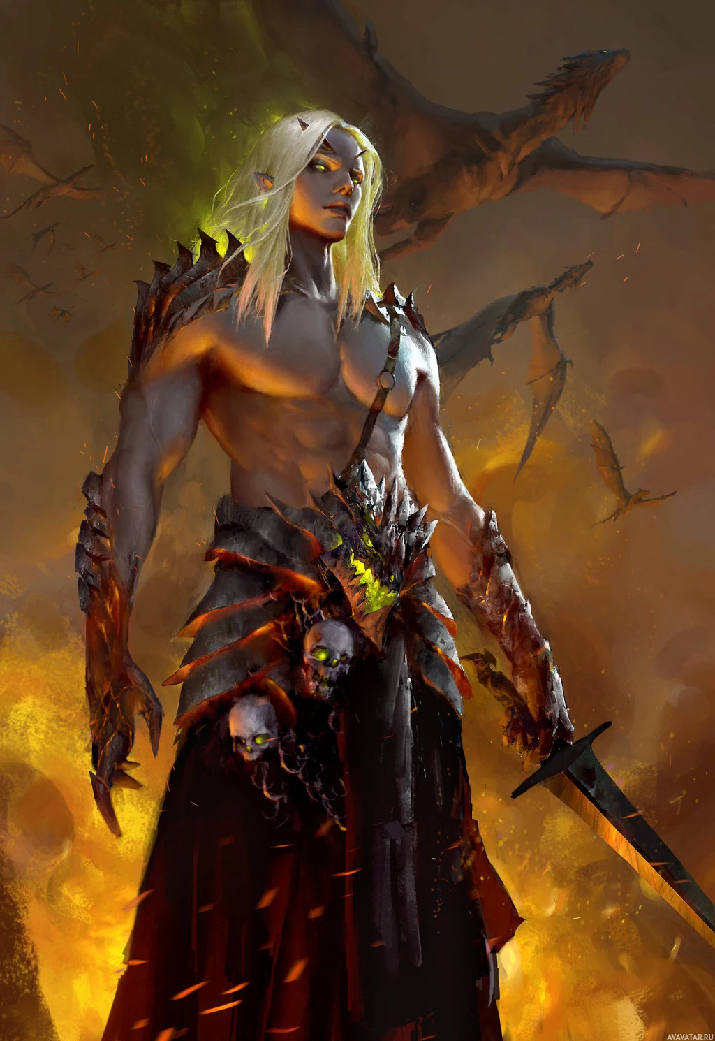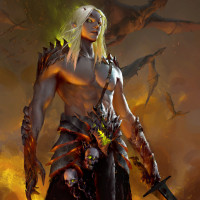 blonde hair, and they are wearing armor that looks like it could be part of the Drow race. The armor includes spiky elements, suggesting a warrior or combatant type. In their hands, they hold a pair of swords crossed in front of them. The background has an ominous, fiery appearance with what appear to be flames or lava flowing around, which could indicate a volcanic or hellish environment. This character is presented in a pose that suggests