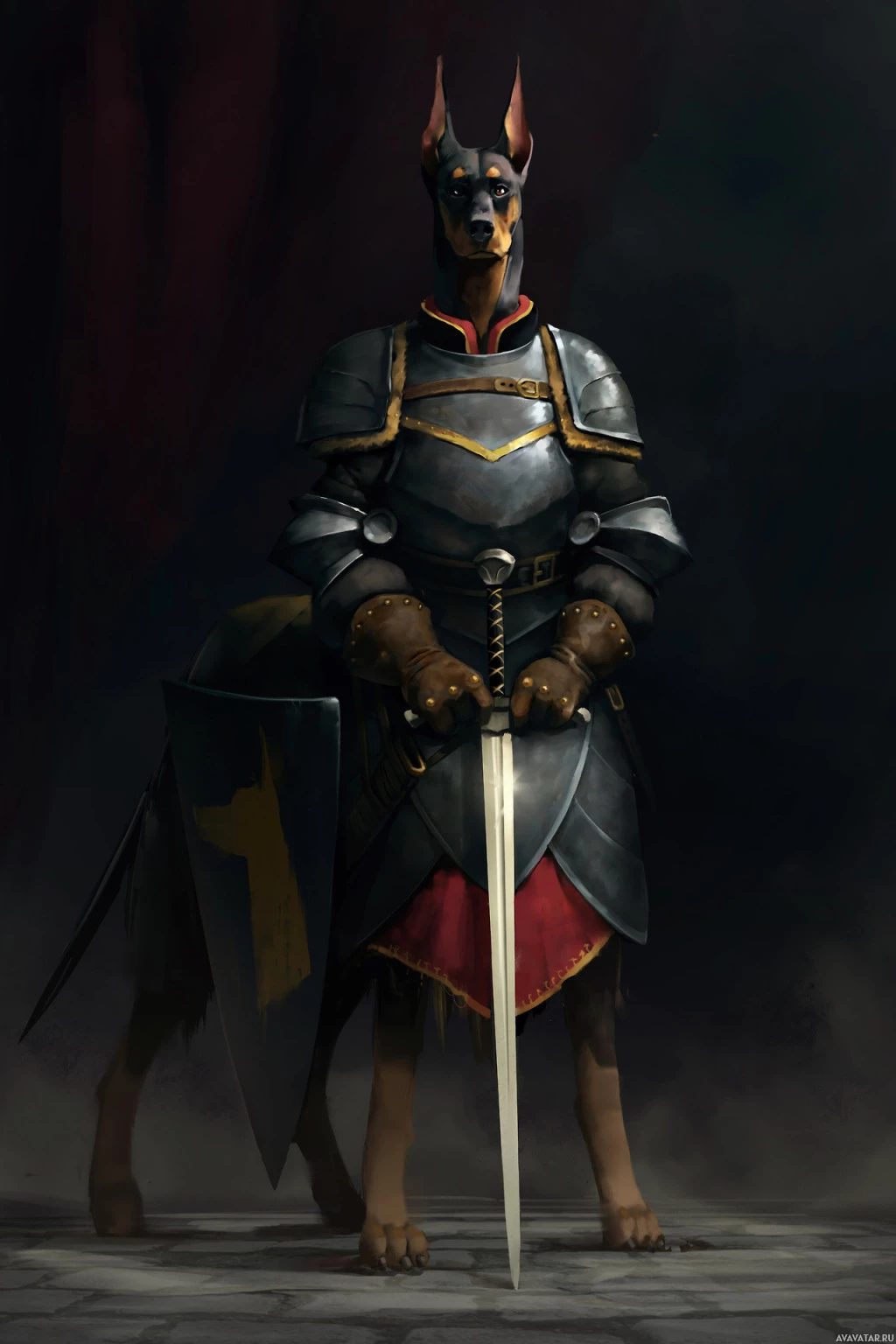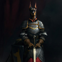 a fantasy creature that resembles a knight standing upright. It is anthropomorphic, meaning it has human-like characteristics. The creature has the body of a dog with its characteristic snout and ears, but it's dressed in