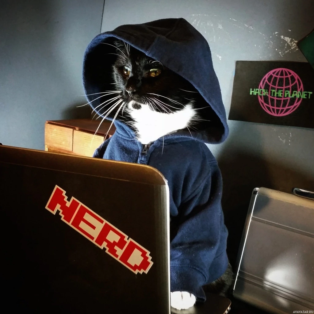 На картинке изображен кот, одетый в толстовку с капюшоном и сидящий перед ноутбуком. На ноутбуке видна наклейка со словом «Nerd». Кошка, кажется, смотрит в камеру, придавая милый и несколько человекоподобный вид.