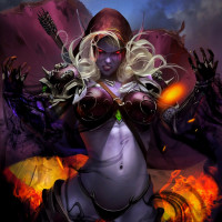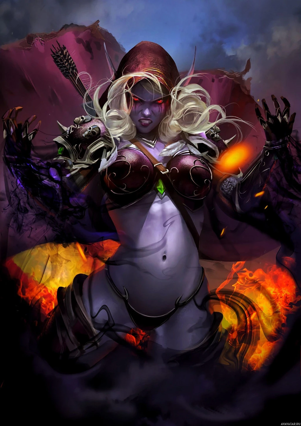 blonde hair with red eyes, which might suggest she is a drow, a race known for their dark skin, white teeth, and red or purple eyes. The character is wearing armor and holding what seems to be magical items, indicating that she may have
