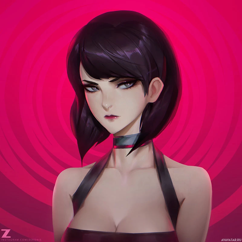 На картинке показана 3D-иллюстрация женского персонажа с черными волосами, носящего черный наряд с красными акцентами. Она имеет строгое выражение на лице и установлена на ярком фоне, который имеет красные и фиолетовые оттенки с закрученными узорами вокруг нее.